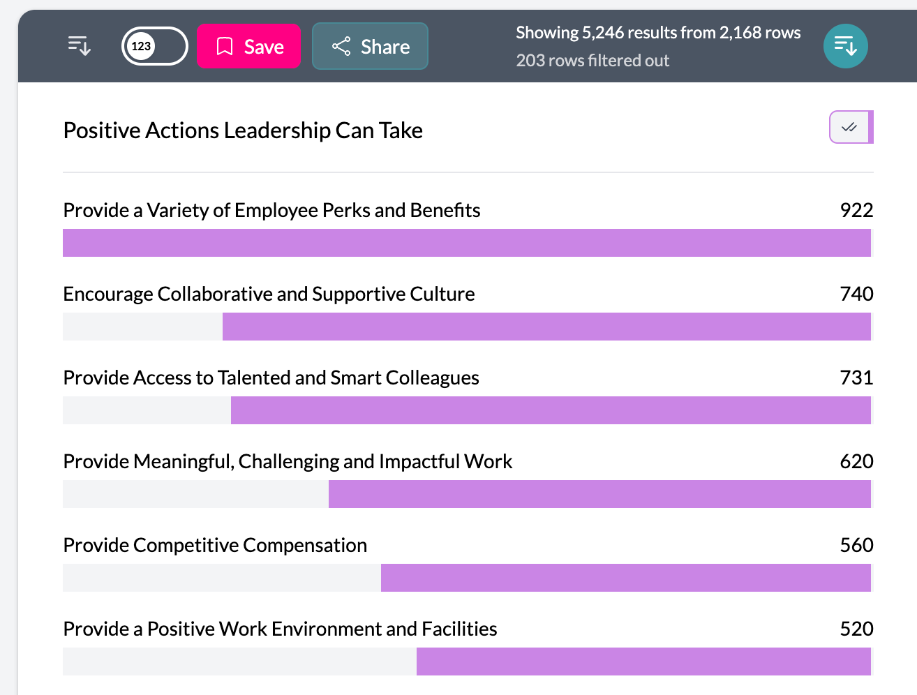 - Best for long labels and many categories; sort and filter via left-hand controls.