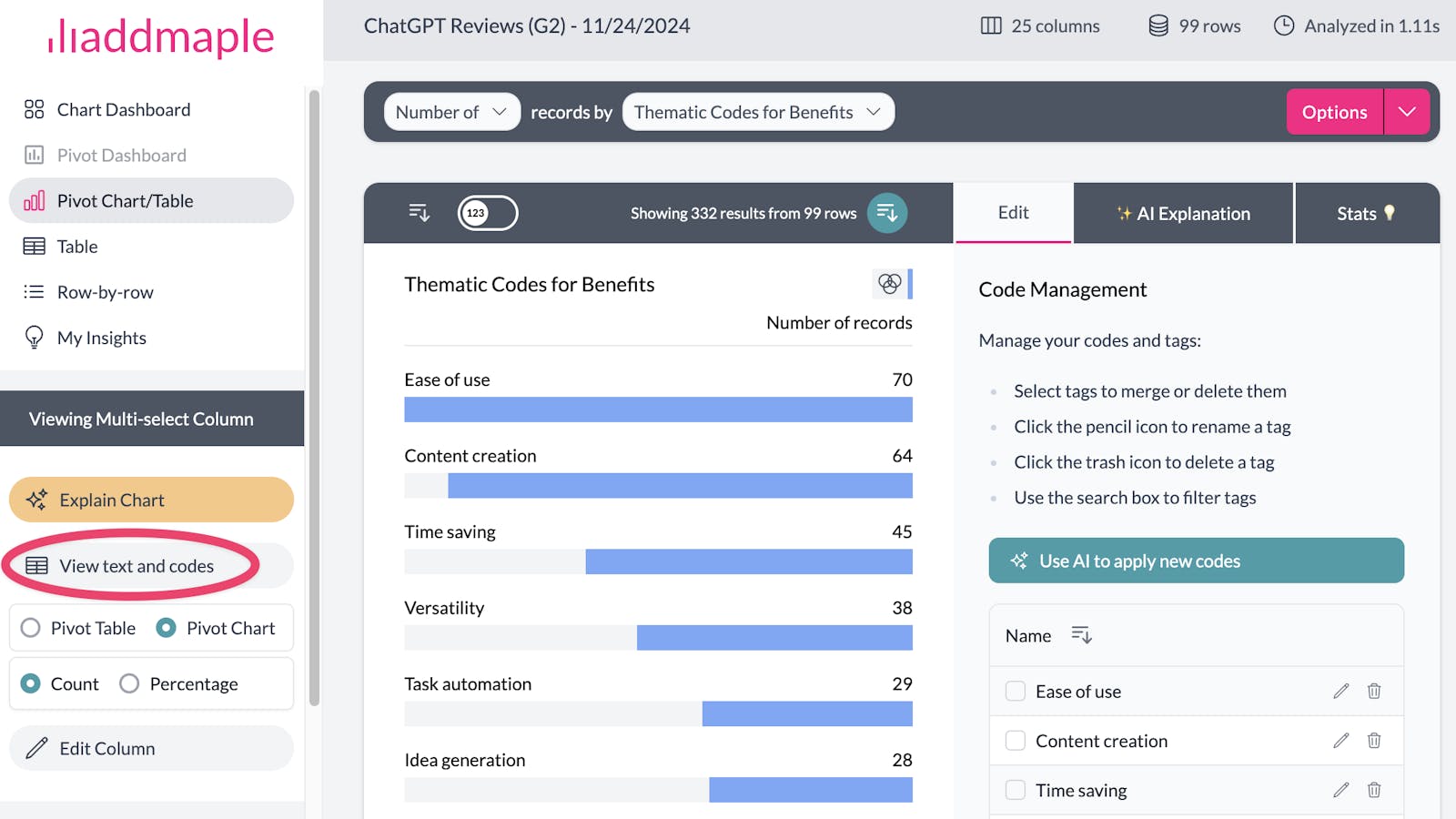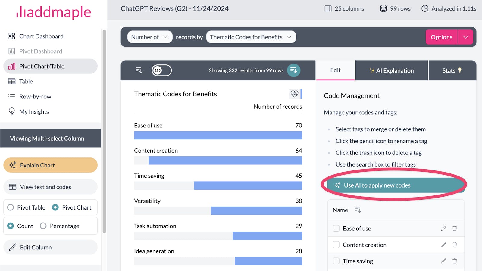 If you’ve manually added new codes and want AddMaple’s AI engine to apply them across the rest of your column, simply return to the chart view for your thematic codes and click “Use AI to apply new codes.”