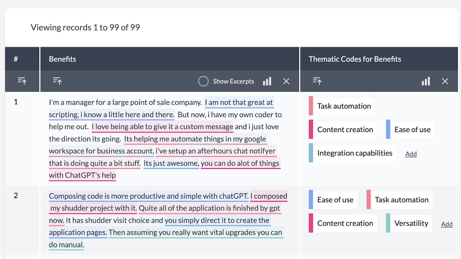 This will take you to the table view where you can see the text column along side the thematic codes.