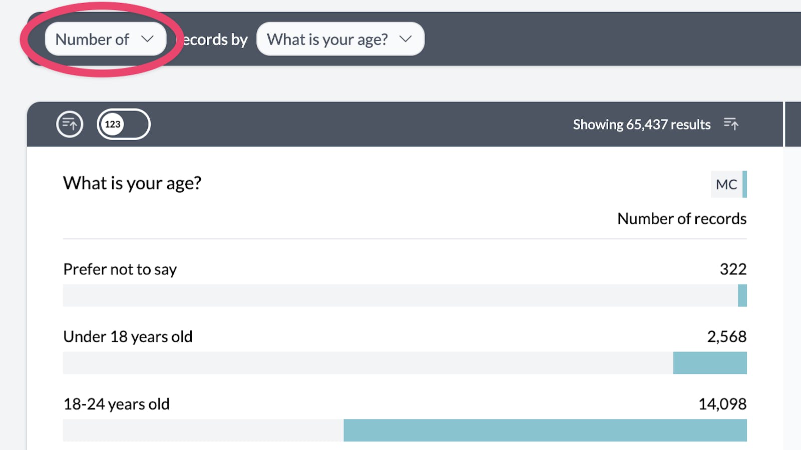 AddMaple allows you to aggregate one column by another. For example if you have a numeric column - Salary, and a categorical column - Age Range, you can use AddMaple to view median salary by age range.You can aggregate from any pivot chart by clicking on the "Number of" button in the sentence bar.