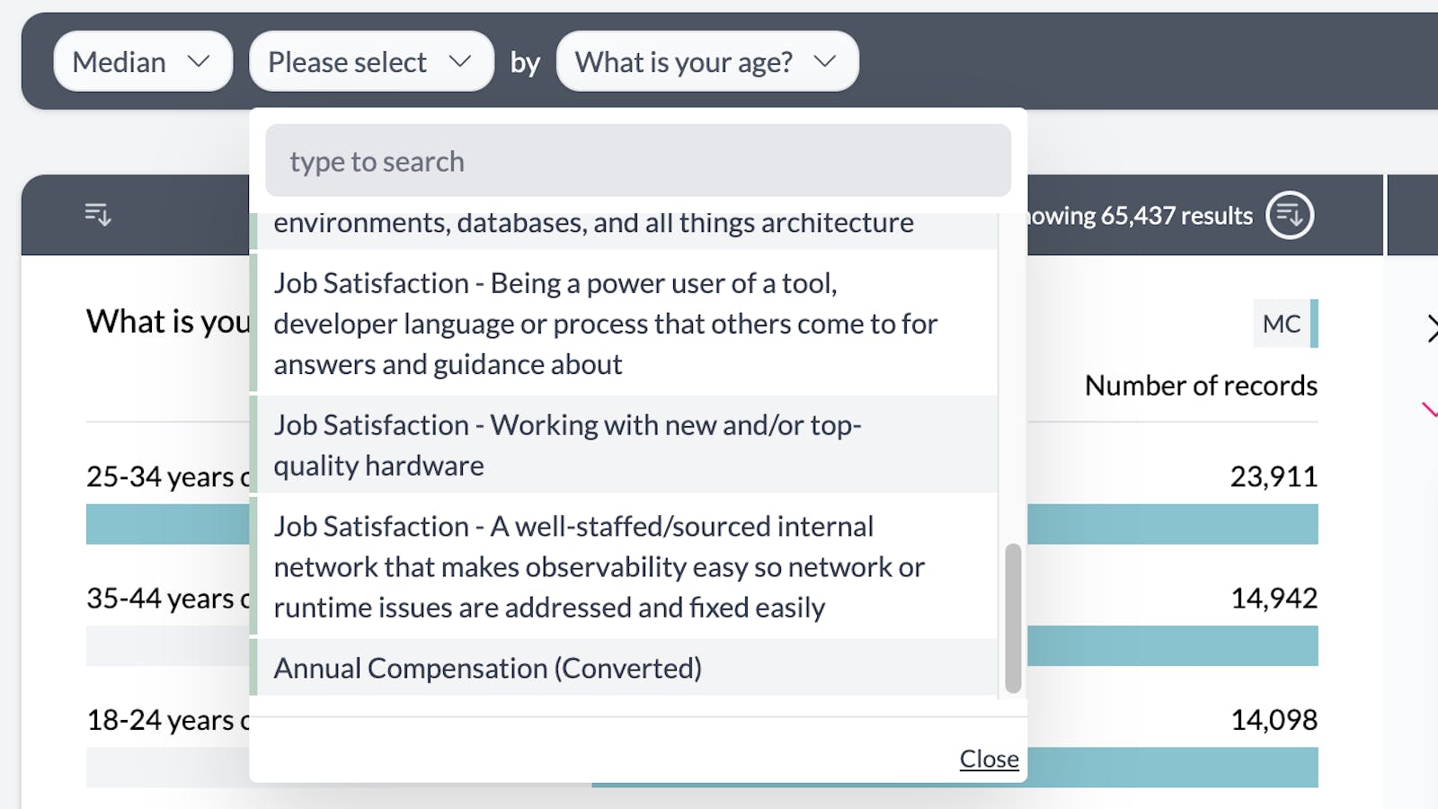 This is another example showing the "Count Unique" aggregation option. Here we can see the unique industries represented per database environment (this is from a developer survey).