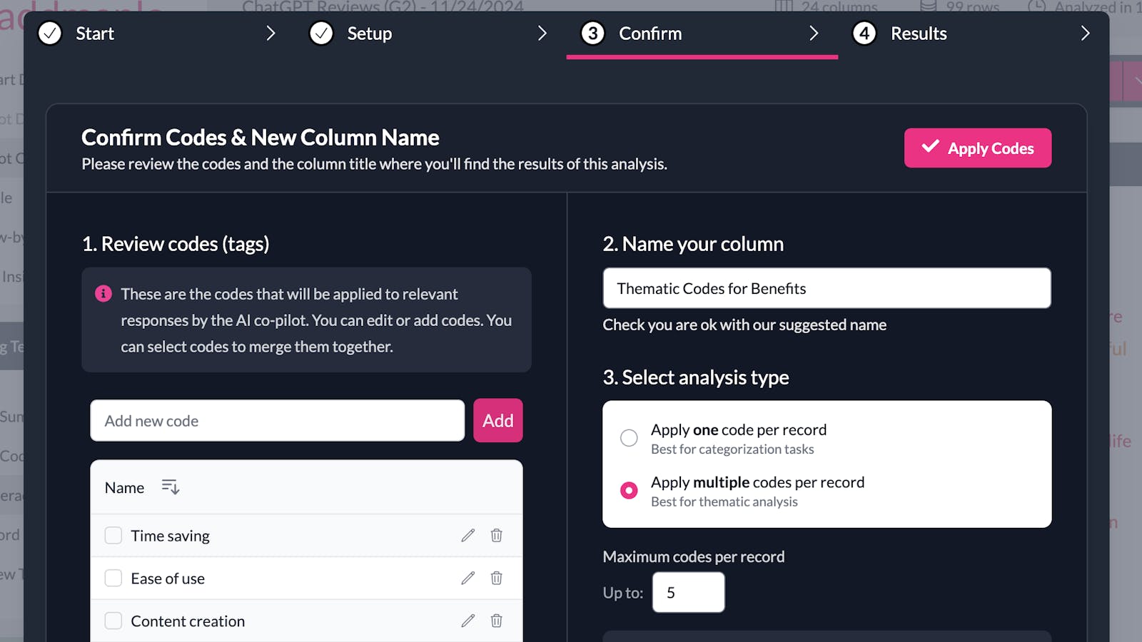 On this screen, you can also specify the number of codes you’d like to generate. Choosing a smaller number, such as 5, will produce broad themes, while selecting a higher number, like 30, will generate more detailed, fine-grained codes.