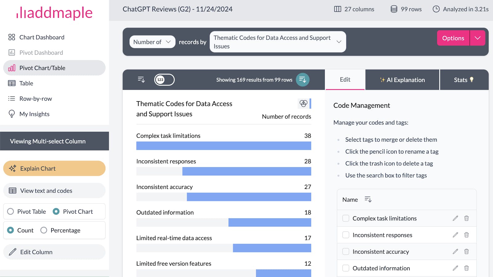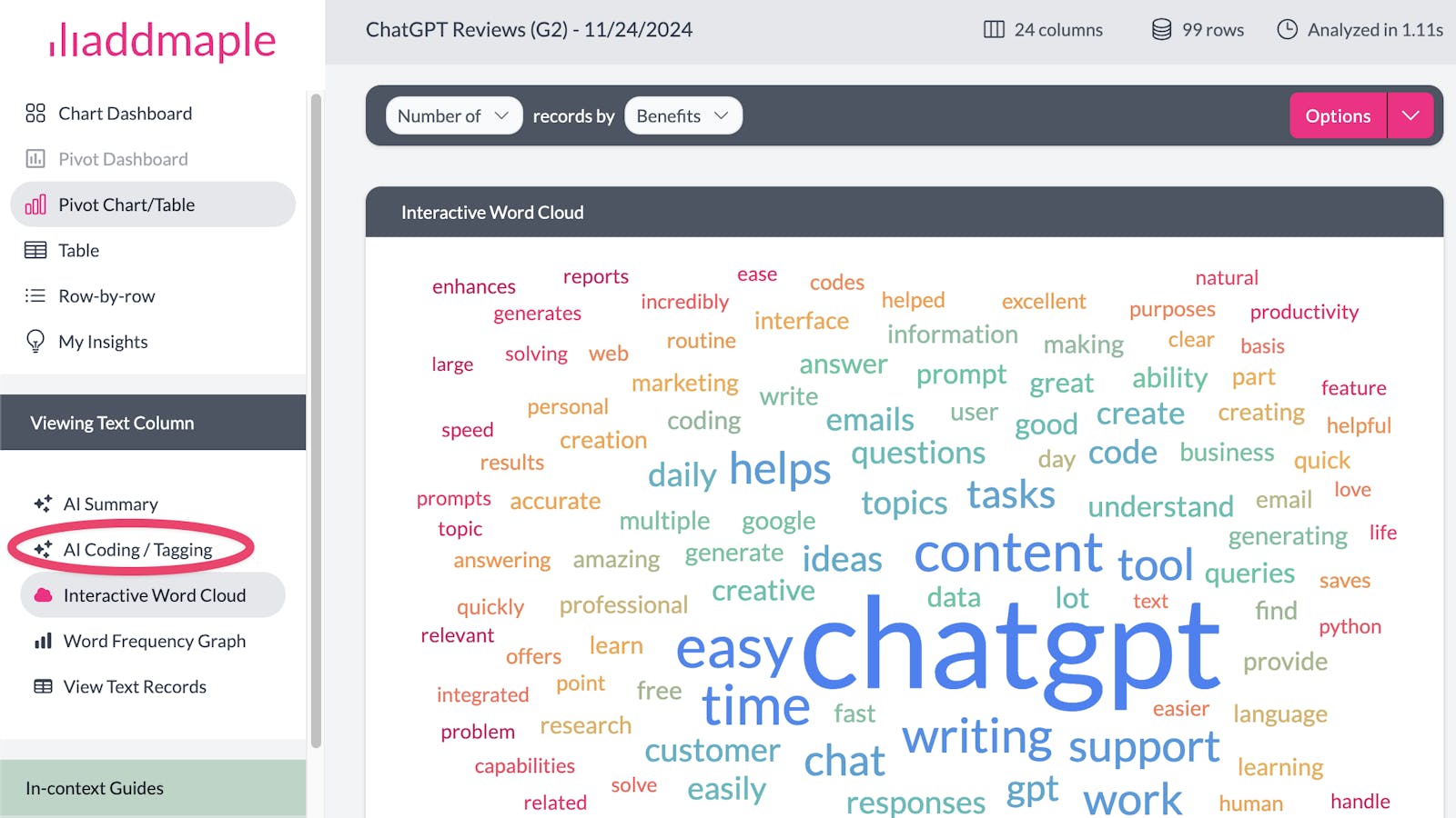 With AddMaple, you can create multiple analysis columns from a single text column. This flexibility is especially useful when coding a column from different perspectives to get richer insights.