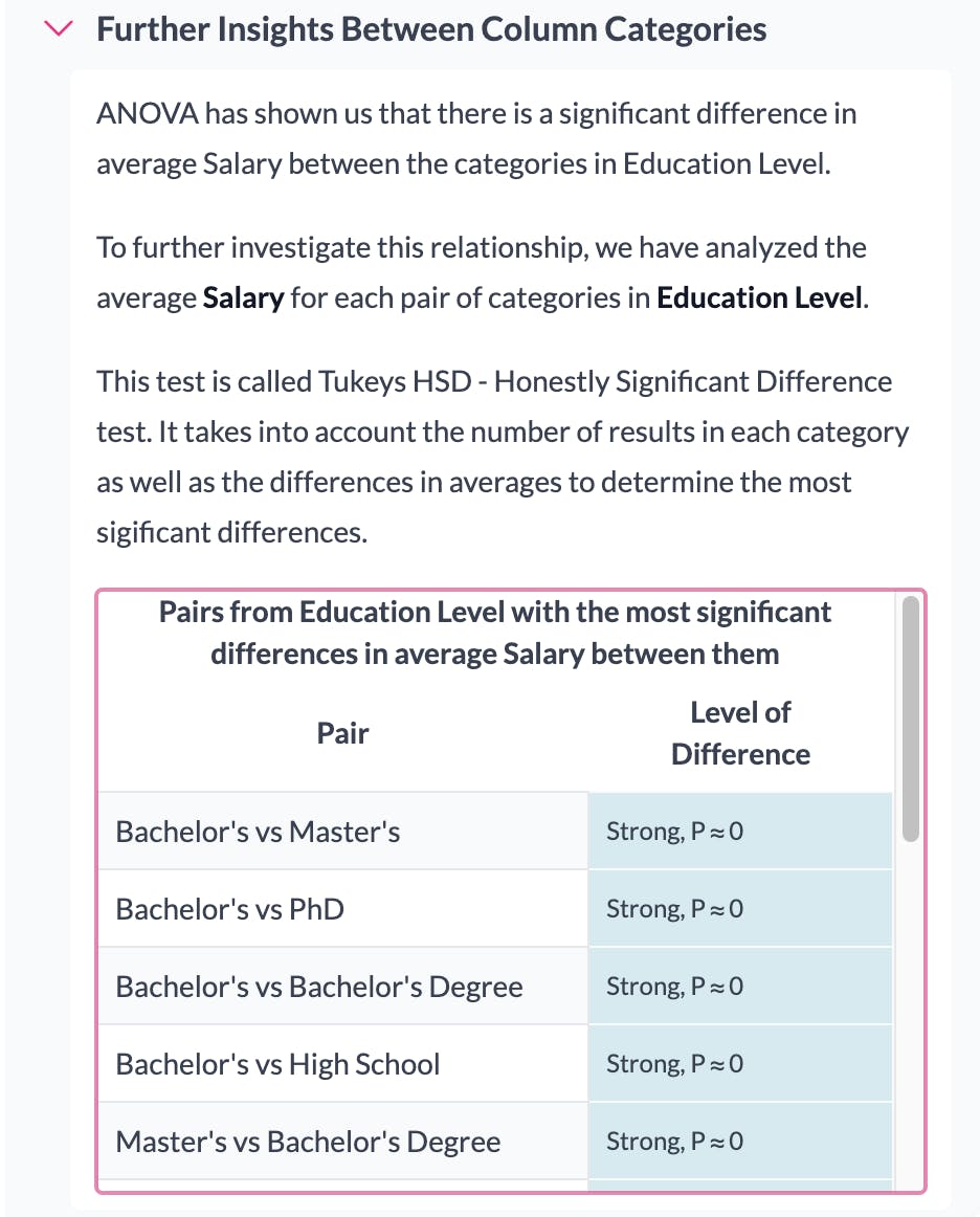 We also perform Tukeys HSD on the categories. This determines which pair of categories have the most significant differences. In this example we can see that the most significant difference in salaries was between those with a Bachelor's degree vs those with a Master's.