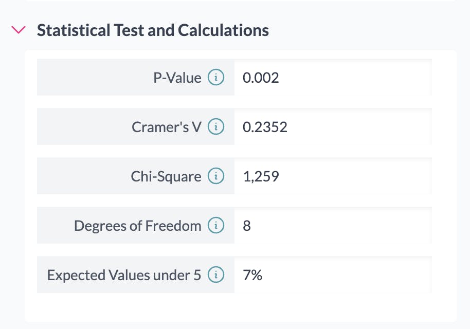AddMaple runs chi-square tests for you automatically to determine whether there is a significant relationship between two categorical columns and the strength of that relationship.