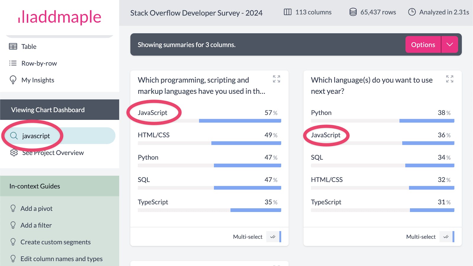If no column is found with a matching name, AddMaple will search within categories in a column. In this example columns have been found that have the word "javascript" as one of the categories. 3searching for columns