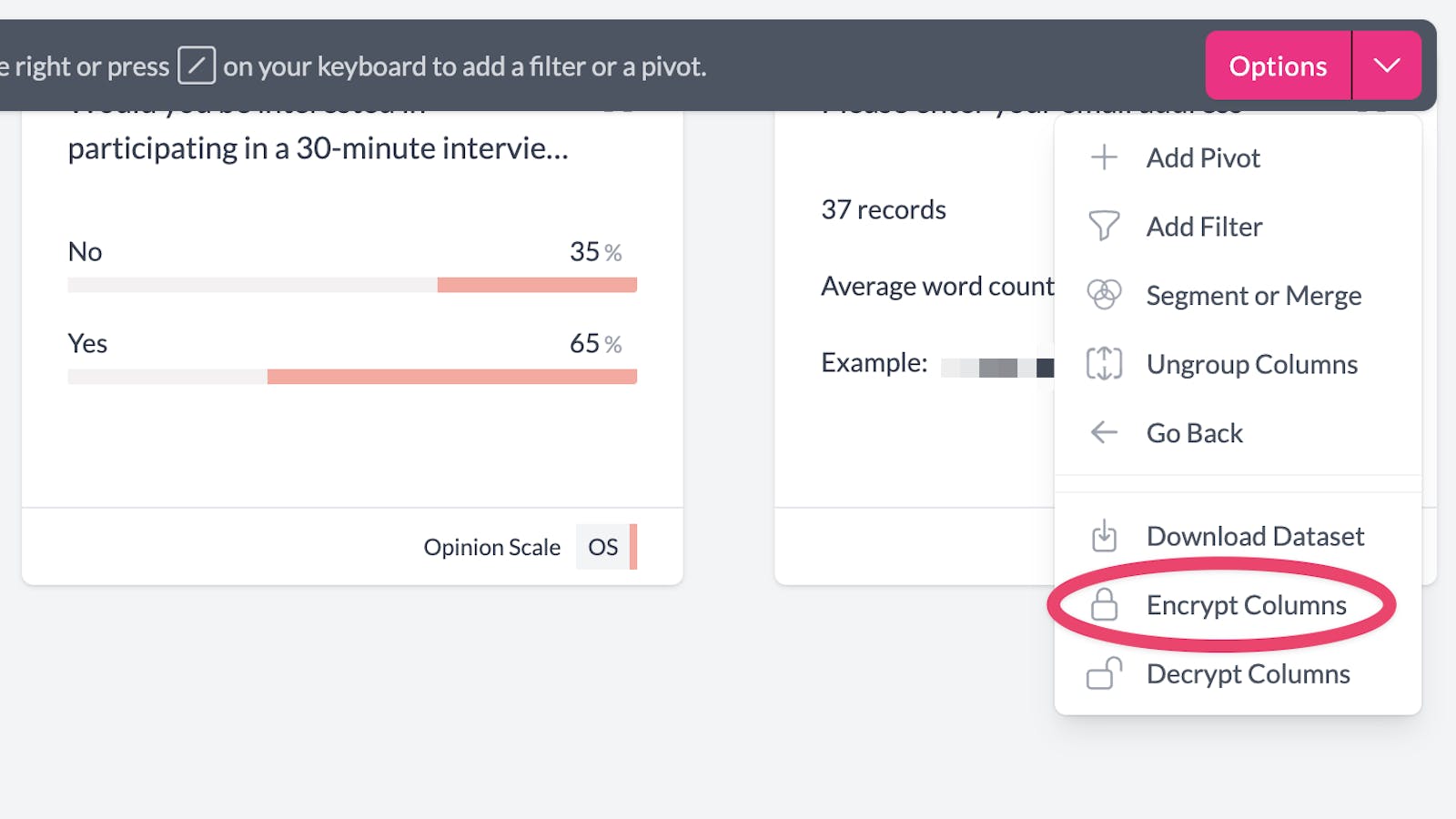 To encrypt the column, go to the Chart Dashboard and then click on the Options menu. Select "Encrypt Columns"