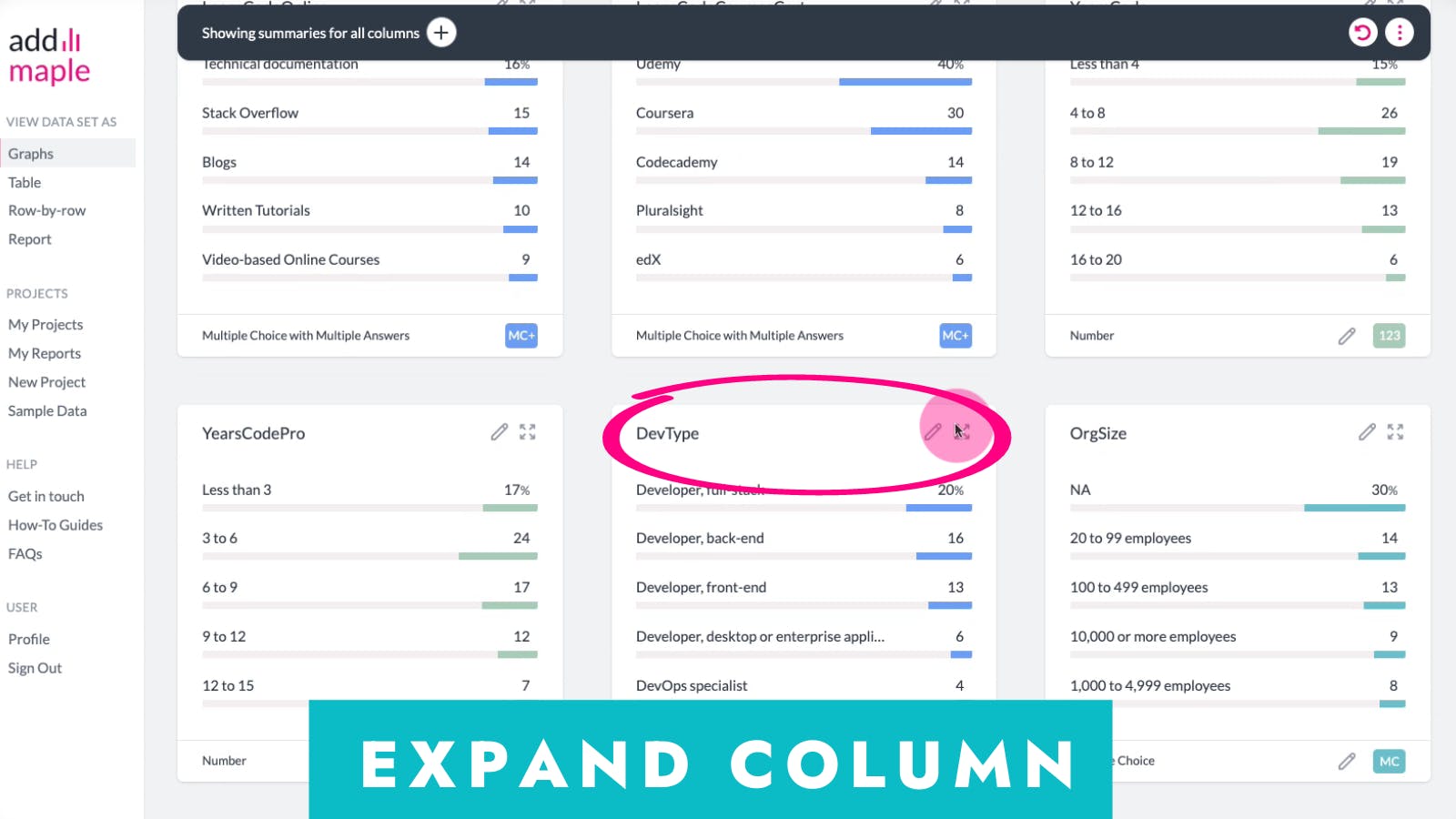 When AddMaple reads your data file in your browser, it will automatically show you a graph summary page of ALL your data. That means all your columns will be analyzed and visualized as graphs in seconds. This happens automatically, you don’t need to do anything other than give AddMaple read-only permission. The column order from your raw data from left to right, will be represented in the same order on the graph summary from top to bottom.