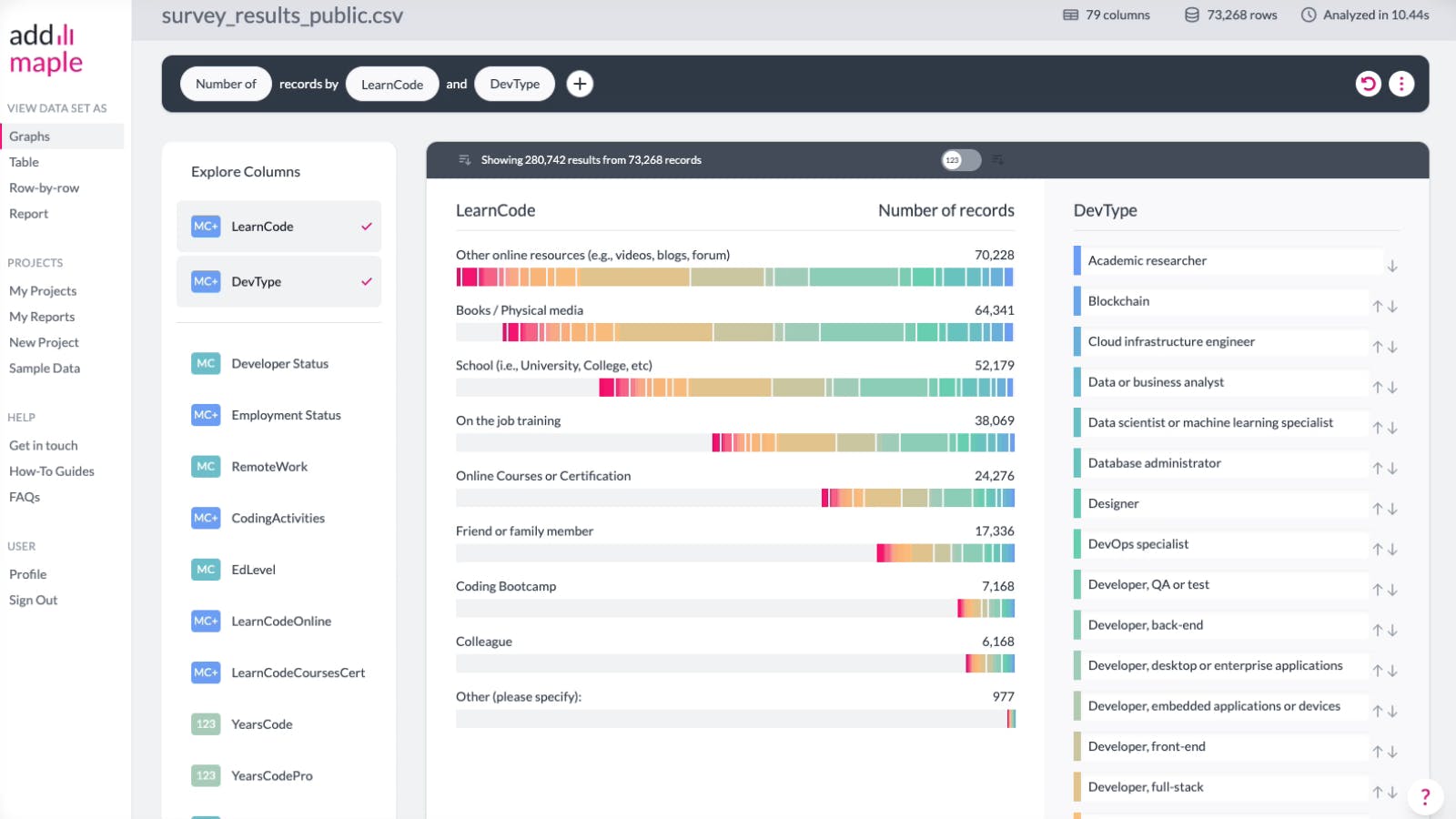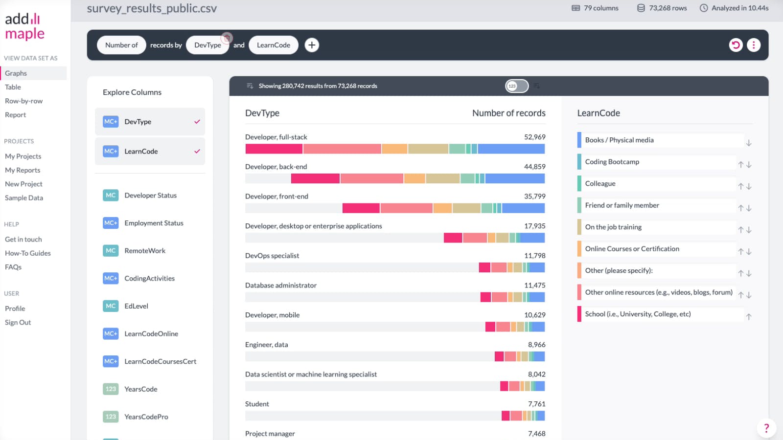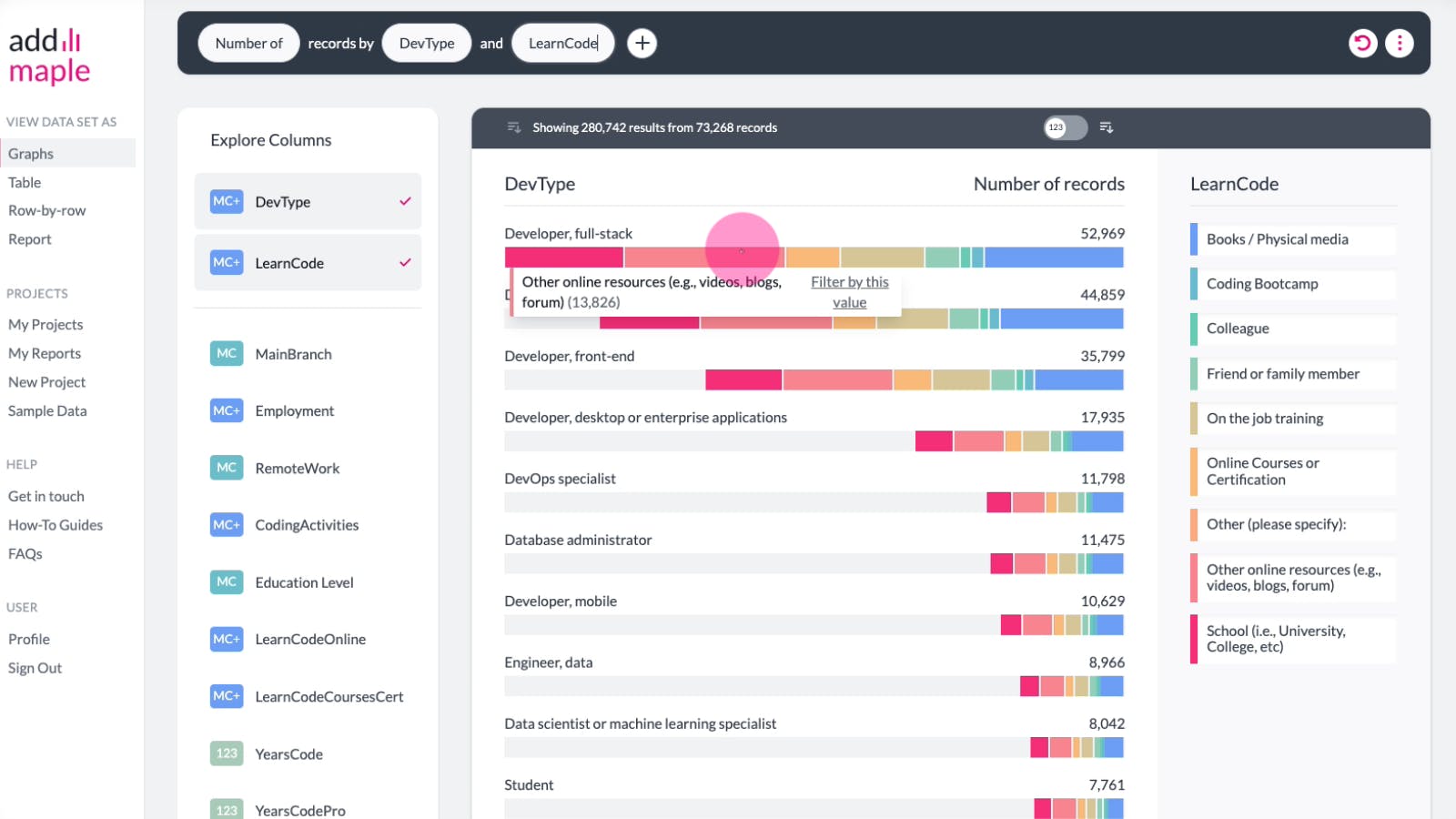 - Add filters by clicking on a response in that record [0.28]. In the tutorial example, we filter by developers who learned to code using "Other online resources (e.g. videos, blogs, forums)" by clicking on that response.