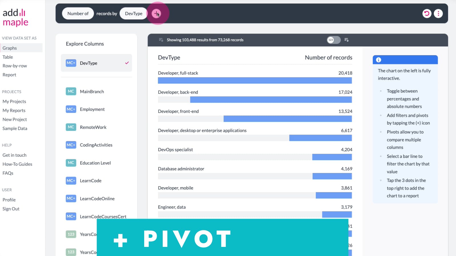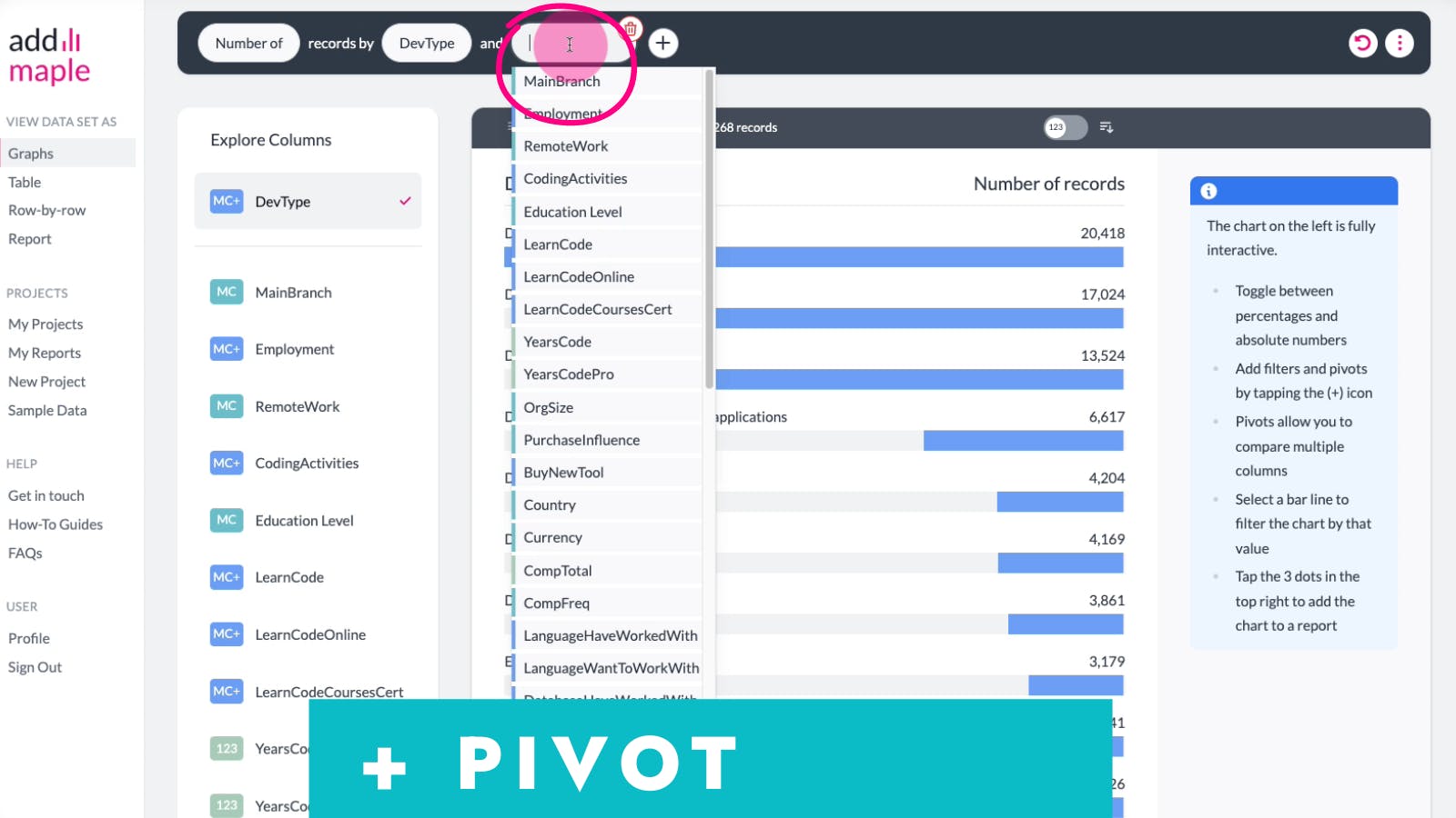 Expand the graph you would like to add pivots to. In our example this is the type of developer column, "DevType".