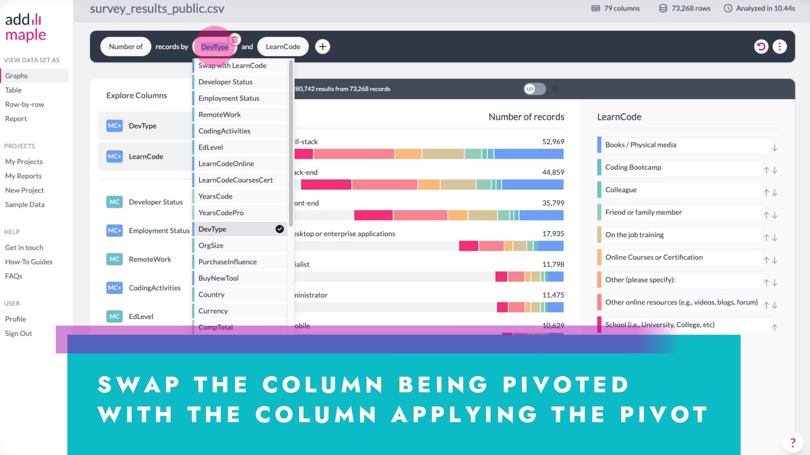 You can easily swap the pivot columns thus swapping the column being pivoted (sliced in segments) with the column applying the pivoting. Below we pivot the type of developer column with how they learned to code. And then we swap these two around, to look at how developers learned to code by the type of development work they do.