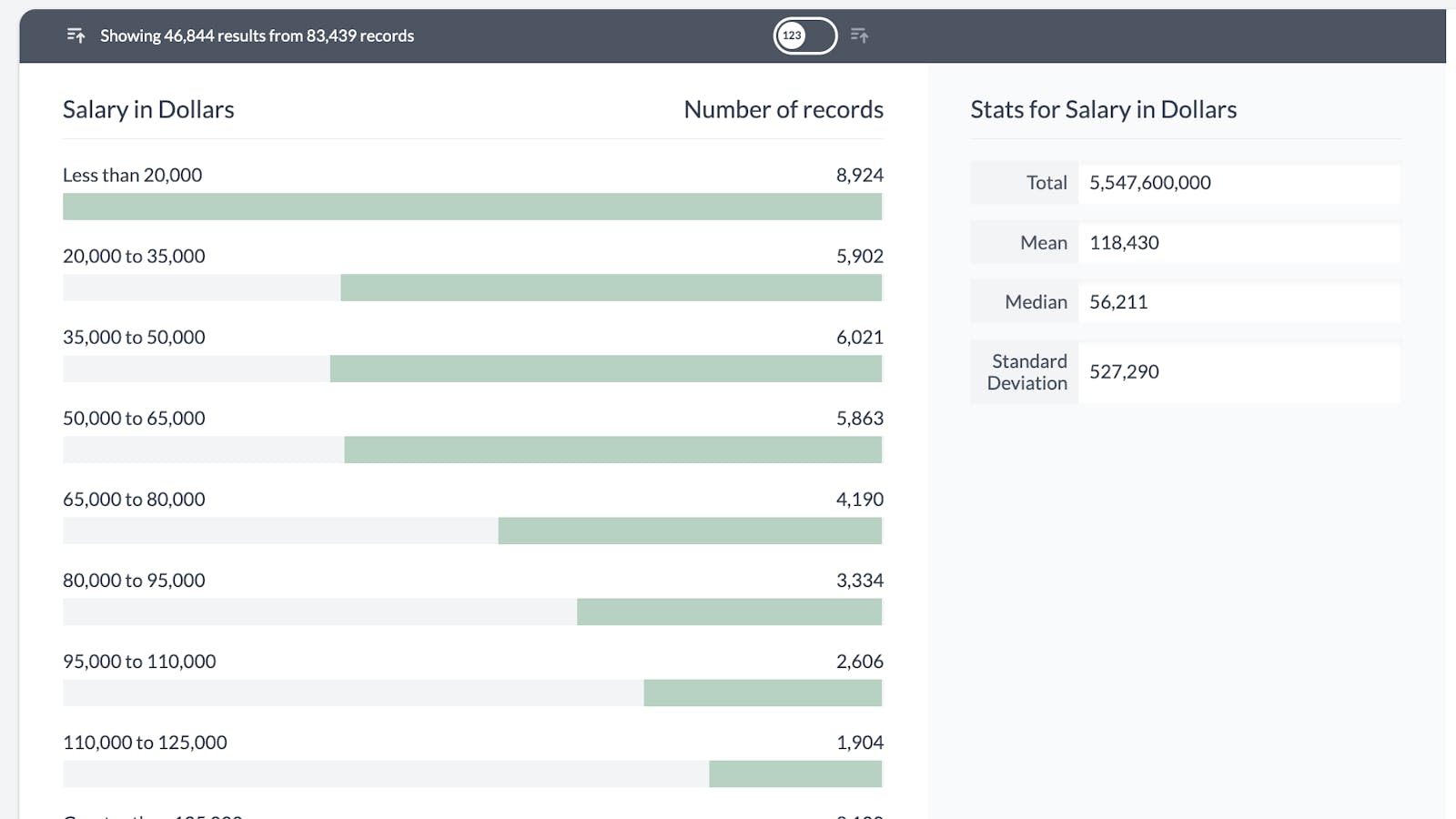 Numeric data such as salaries, ages, product quantities sold and so on. With numeric data identified, we determine the highest and lowest values (maximum and minimum) and help you create bins or buckets with an even spread of data. This is why you would see a histogram waiting for you on the dashboard. These columns are labeled as NUM and are green. We also detect **Currencies and Percentages **- they show up with specific icons in our interface but you interact with them in the same way as our numeric columns.