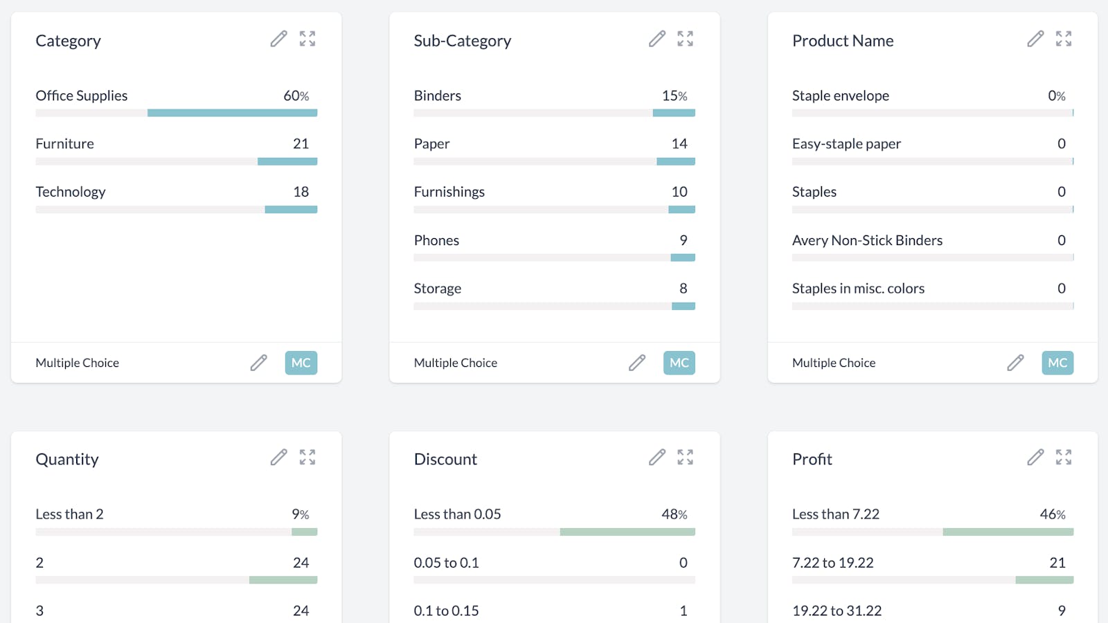 **Categorical data **such as answers to a multiple choice question. We detect when columns only contain one tag, for example, the column titled 'Country of Birth', would only contain one country for each record in the column as a tag. We also detect when a column contains multiple tags in one column, for example, responses to the question, 'Select all supermarkets you visited last month' would contain more than one supermarket, with each record having a different combination of supermarket tags. For these tricky columns, we give you a count of all the supermarkets, so you can see how many times each supermarket was selected. We also allow you to filter by one or more supermarkets, to see all related supermarkets for the ones selected.