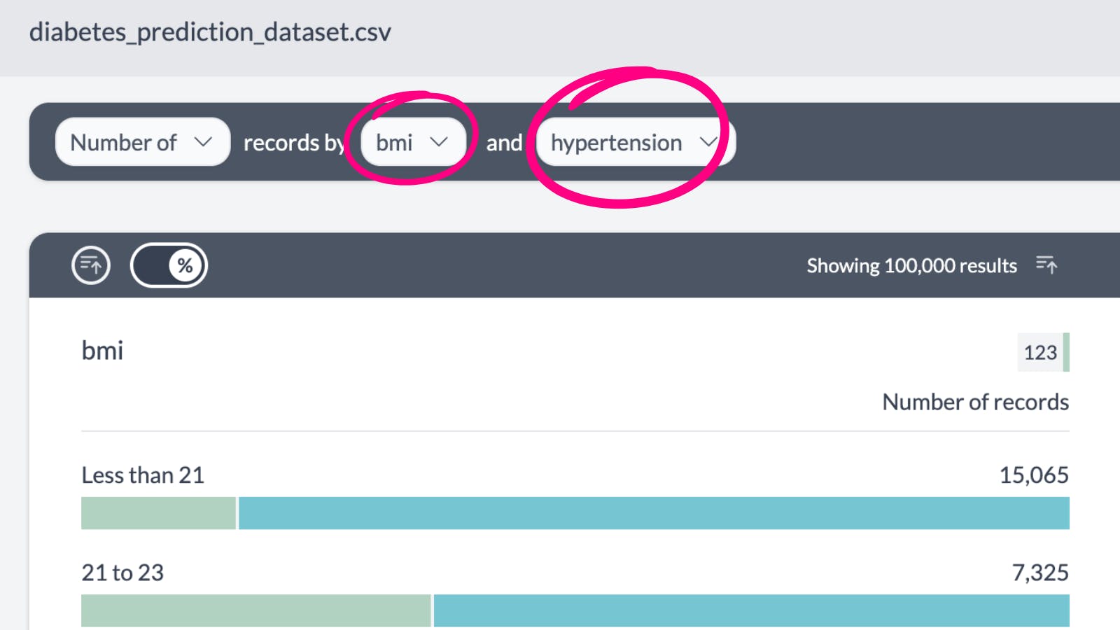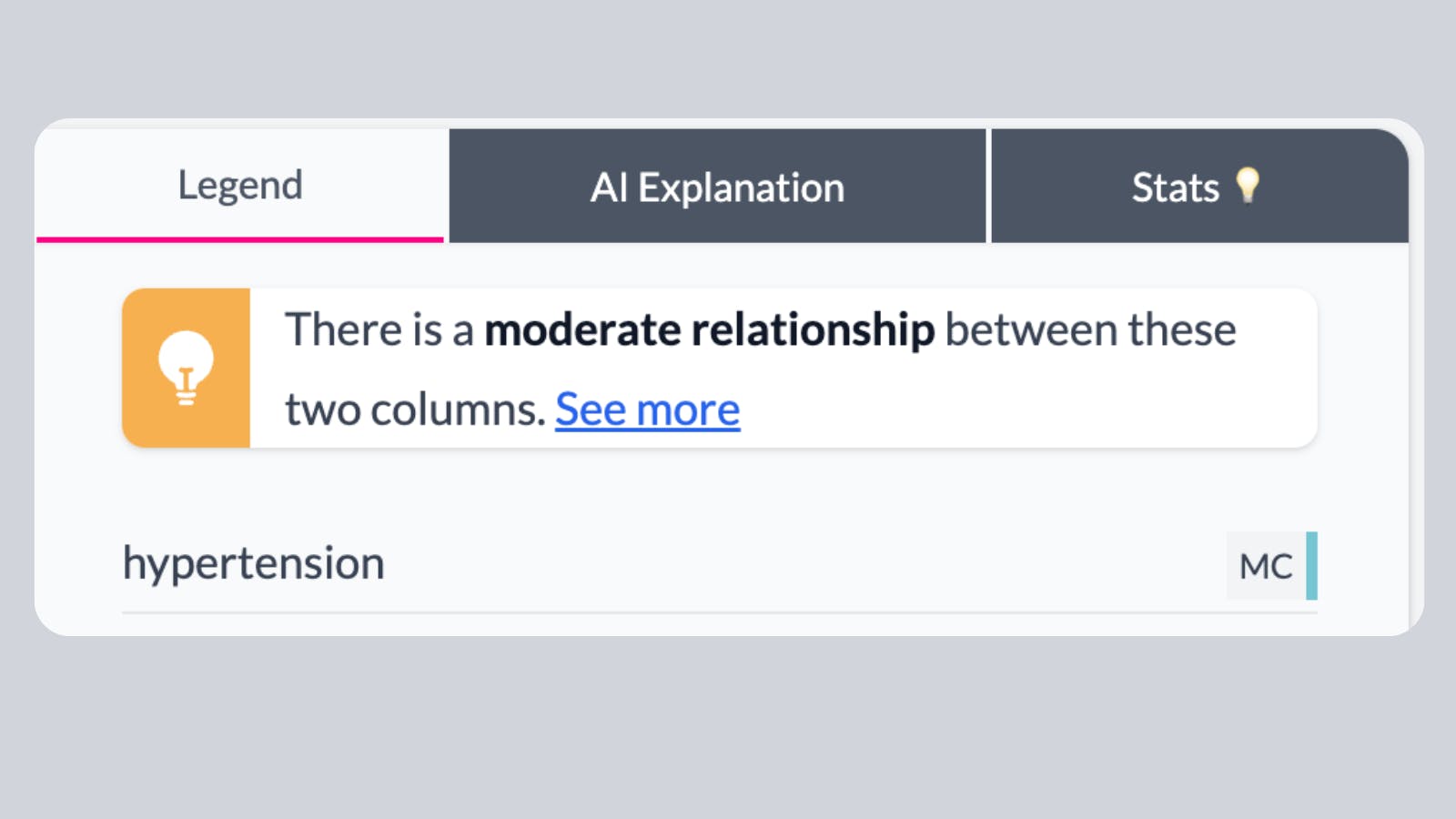 AddMaple performs a 2-sided T-Test automatically when you pivot by a numeric column and a categorical column with only 2 categories. If you want to run a T-Test on a column with more than 2 categories, you first need to filter down to only look at 2 categories.To get started, pivot by the 2 columns. For example in this diabetes prediction dataset we've pivoted by hypertension (category: 1 or 0) and BMI (numeric)